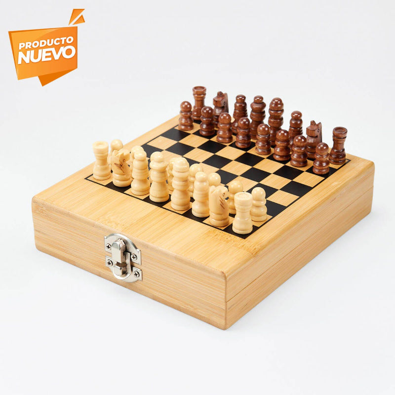 Fabricado en bambú, ideal para los amantes del juego estratégico que valoran la practicidad y el diseño. Incluye 32 piezas en dos tonos de madera (oscuro y claro), perfectamente proporcionadas y almacenables dentro de su propio estuche. El tablero está impreso directamente sobre la tapa del estuche, lo que permite jugar cómodamente y guardar todo con facilidad. Su broche metálico garantiza seguridad durante el transporte. La madera es un producto natural el cual puede presentar variaciones en tonalidades y vetas.