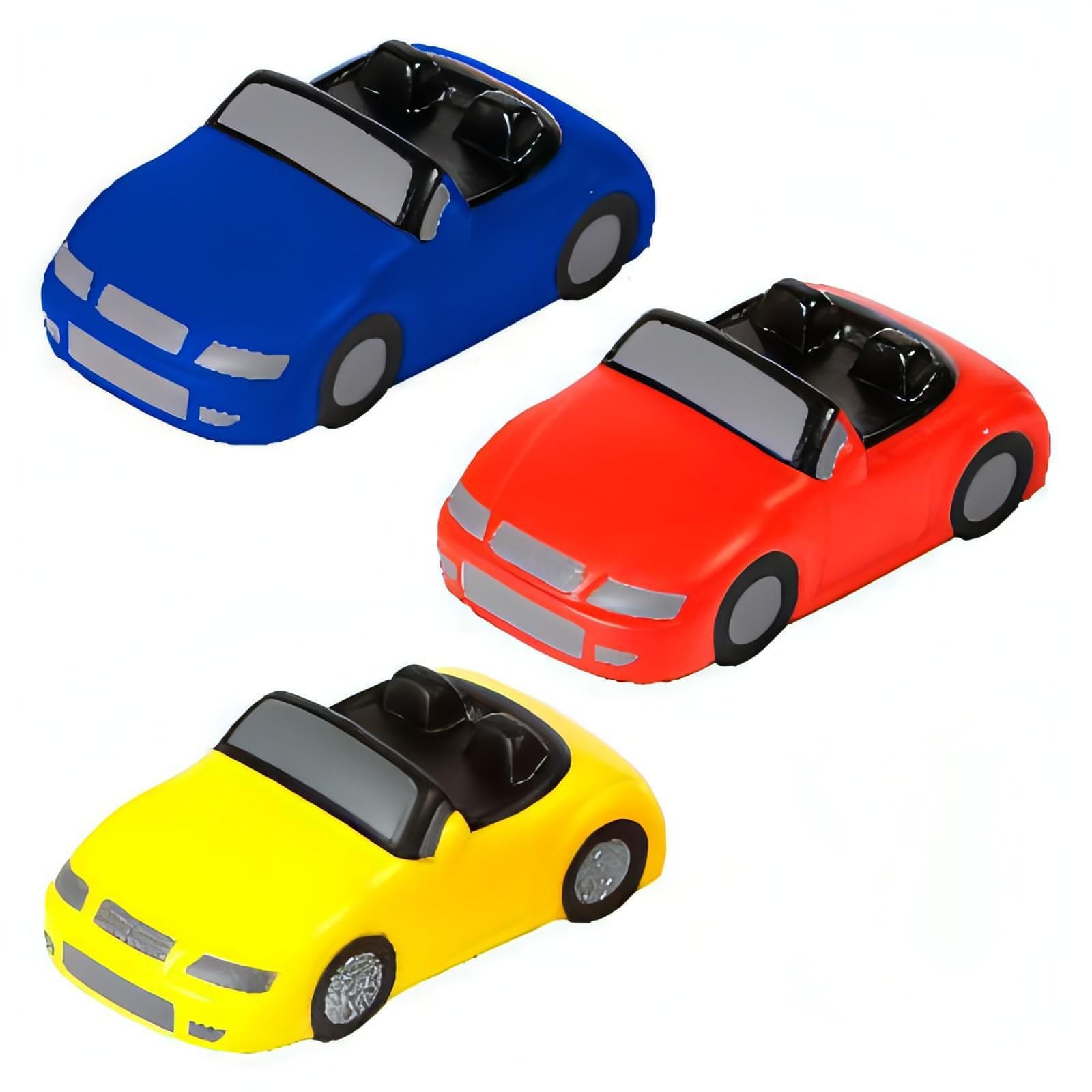 Figura antiestrés en forma de auto, con detalles en color gris y negro, fabricada en poliuretano.