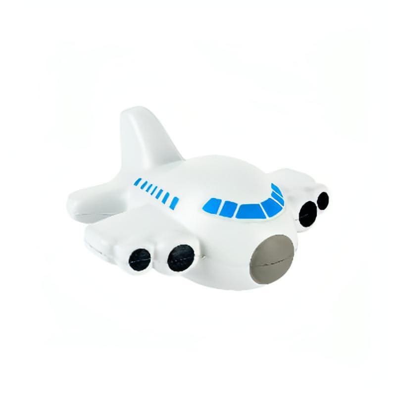 Figura antiestrés en forma de avión, con detalles en color azul, gris y negro, fabricada en poliuretano.