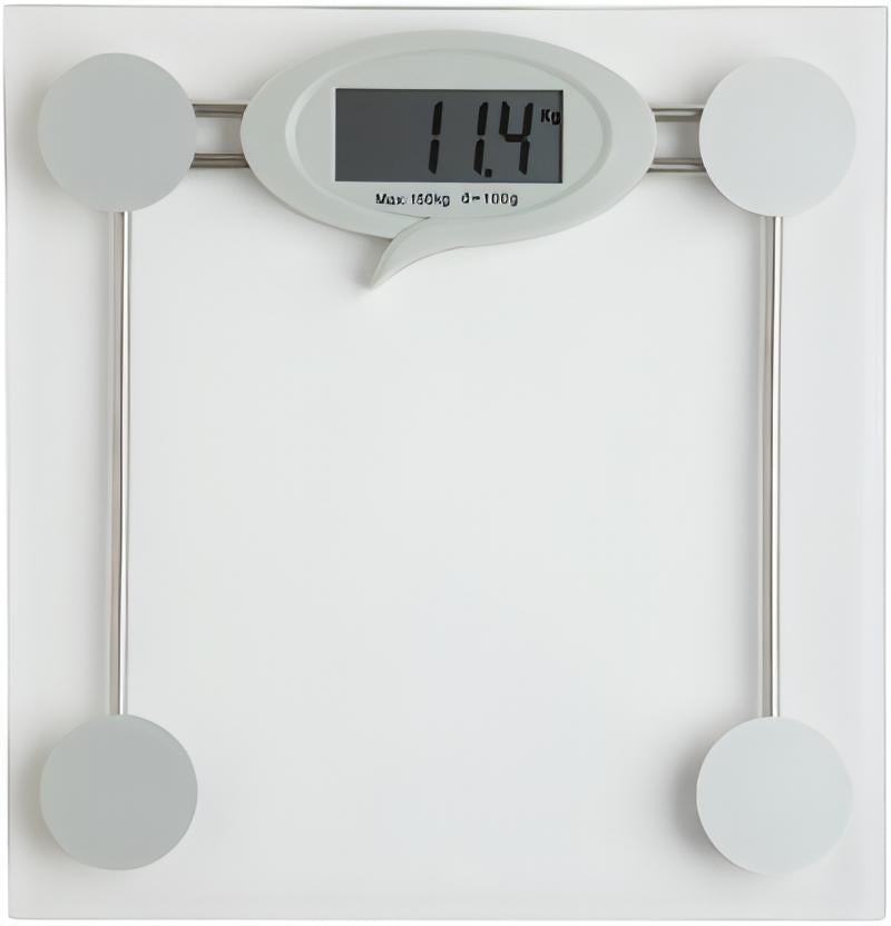 Báscula con pantalla LCD. Encendido y apagado automático. Indicador de batería baja. Peso máximo 150 kg. Funciona con pila botón incluida.