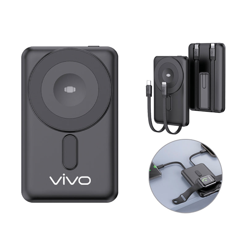 Batería inalámbrica portátil wireless de carga rápida, con función de carga magnética para dispositivos móviles (15W) y relojes inteligentes(2.5W). Capacidad de 5,000 mAh, 5 indicadores de luz de carga de la batería, entrada de carga tipo C (Incluye cable de carga), botón de encendido/apagado y 2 cables de salida para carga de dispositivos móviles: 1 entrada tipo C y uno entrada para iphone. Incluye soporte metálico para dispositivos móviles. Compatible con dispositivos Android e iOS. Presentación: Caja de regalo a color. (Para carga inalámbrica verifique la compatibilidad con sus dispositivos móviles).