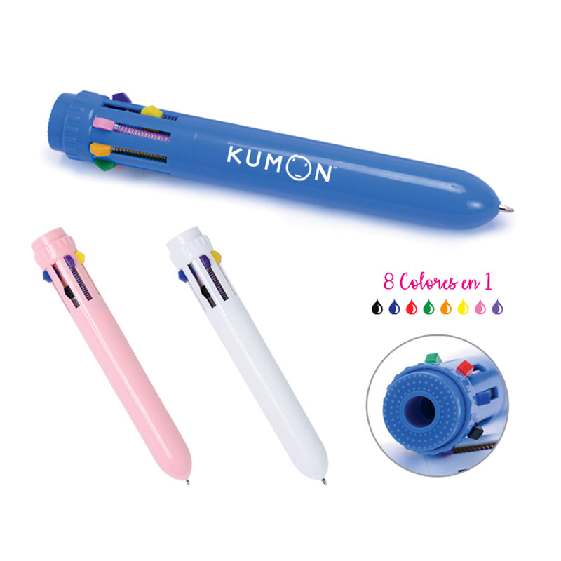 Bolígrafo de plástico multitintas, incluye 8 colores de tinta diferentes.