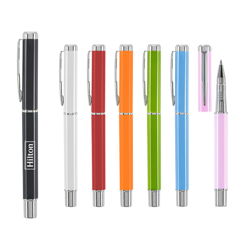 Elegante bolígrafo con tinta de gel en color negro, con cuerpo y tapa en Plástico. Clip métálico.