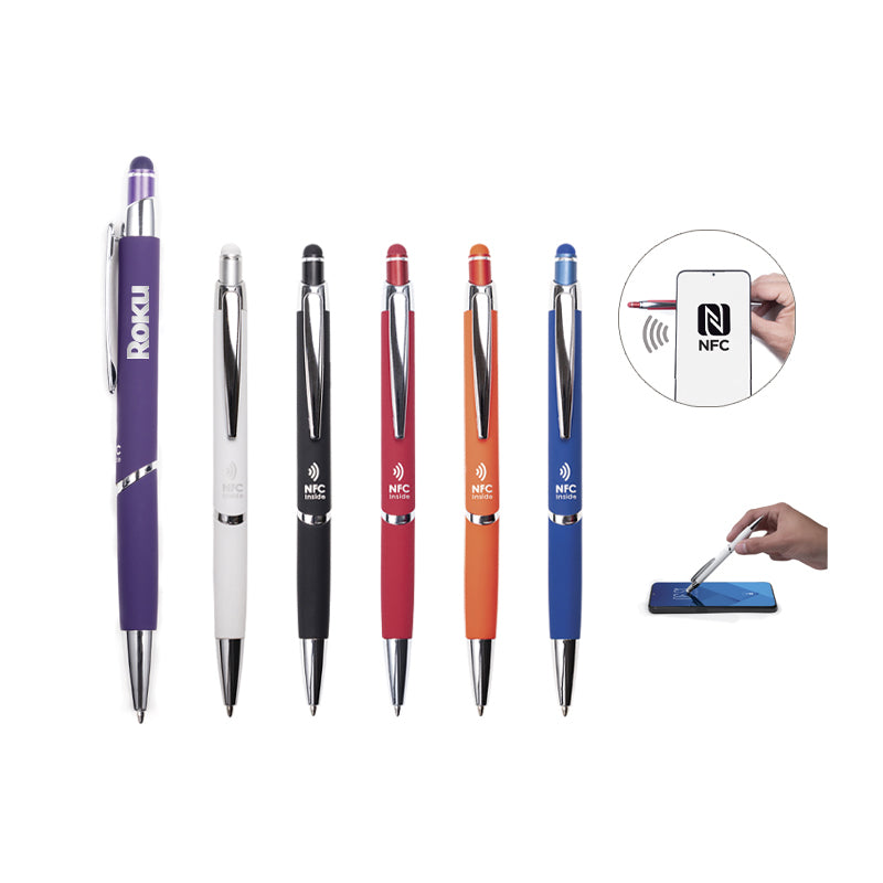 Bolígrafo de aluminio con punta, clip, arillo central y parte superior en cromo; acabado del cuerpo color mate suave al tacto, al grabar destapa en color plata. Cuenta con touch screen en la parte superior del color del bolígrafo. Repuesto en tinta negra alemana de 1?mm. Tiene un Chip NFC en su interior que se enlaza información rápida a la aplicación con NFC, compatible con todos los celulares que cuenten con la aplicación. Compatible para dispositivos Android e iOS.