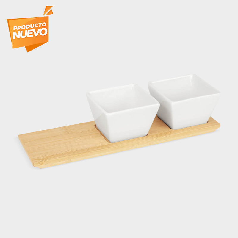 Botanero con base de bambú y dos contenedores de cerámica. Perfectos para servir botanas, dips o salsas con estilo. Ideal para reuniones, cenas o cualquier ocasión donde el diseño y la practicidad se encuentren. Incluye caja individual. El bambú es un producto natural el cual puede presentar variaciones en tonalidades y vetas
