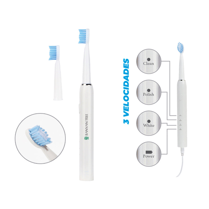 Cepillo de dientes eléctrico con batería de 500 mAh resistente salpicaduras. Cuenta con entrada de carga redonda DC (Incluye cable de carga). Cuenta con botón de encendido y apagado, 3 modalidades de limpieza, indicador de carga y 2 cabezales de repuesto con tapa protectora. Tiempo de carga: 3 hrs. Duración de la batería de 30 días aprox. (uso de 2 min. por cada aseo dental). Presentación: caja de regalo a color.