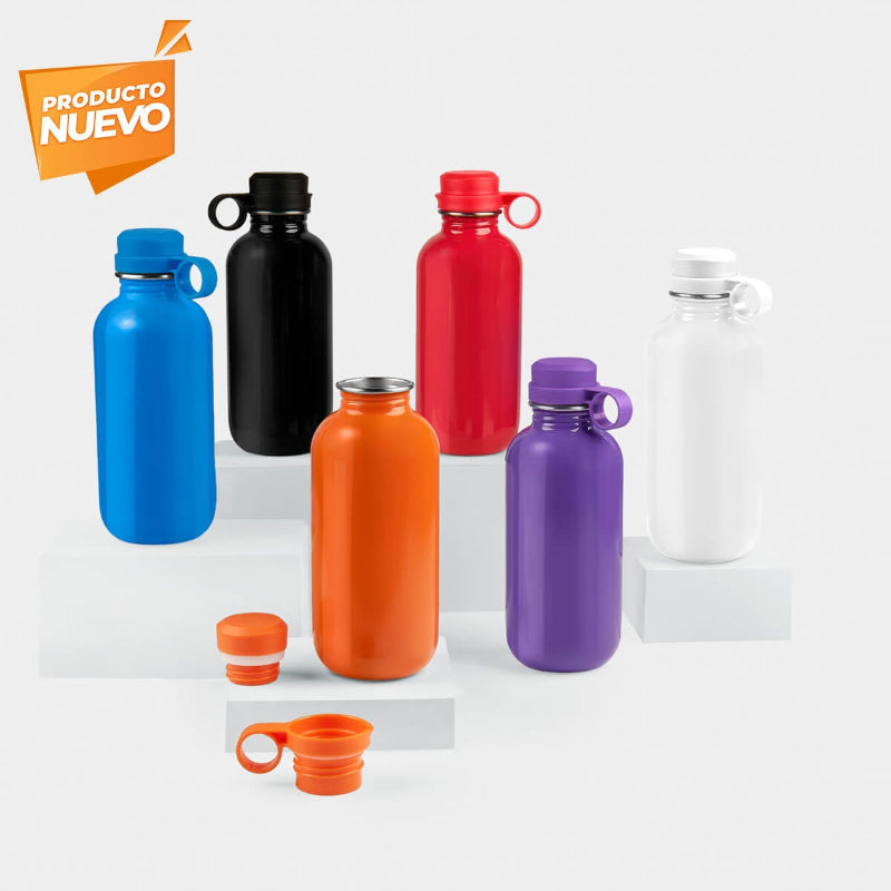 Cilindro metálico de una pared. Incluye tapa de plástico con sistema de rosca para un cierre hermético. Adicional, su misma tapa incluye una segunda rosca que incorporar un filtro para preparar té o infusiones. El asa en la tapa permite transportarlo con mayor comodidad. Capacidad de 22 Oz. Incluye caja individual.