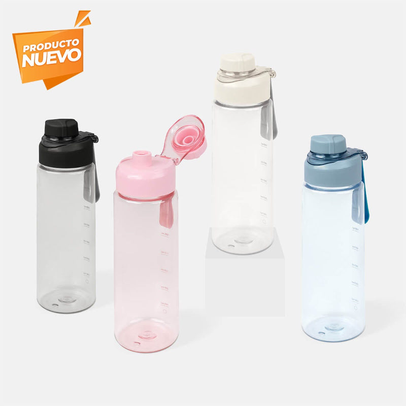 Cilindro de plástico de una pared. Tapa de plástico con sistema de rosca y sobretapa para la boquilla. Cuenta con asa de silicón para llevarlo cómodamente e indicador de mililitros. Perfecto para el día a día.