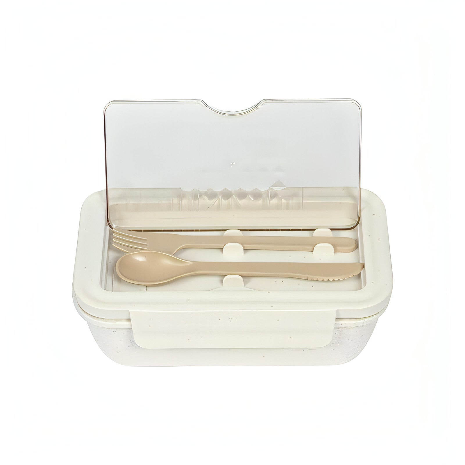 Contenedor para alimentos fabricado en 25% fibra de trigo y 75% polipropileno; con 2 compartimentos, tapa transparente y cubiertos fabricados en el mismo material. Capacidad de 1100 ml.