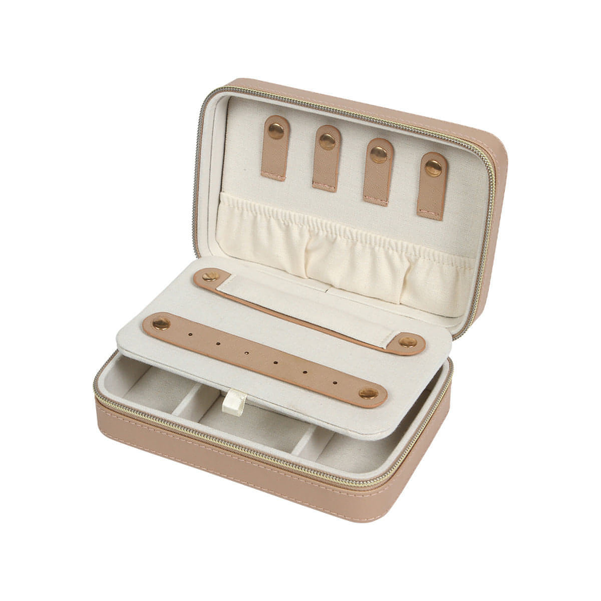 Contenedor para almacenar joyería, fabricado en cartón, curpiel y tela, cuenta con diversos compartimentos internos. Incluye caja de cartón individual.