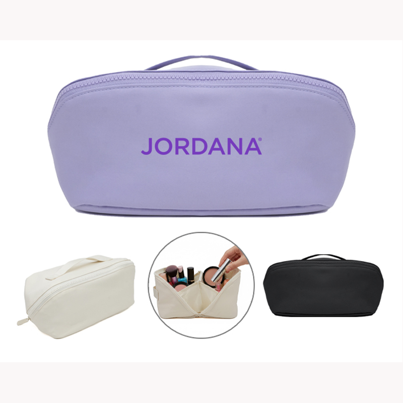 Cosmetiquera / neceser de viaje rectangular con asa y cierre cruzado, que le da mayor amplitud, permitiendo abrirlo en su totalidad. En su interior cuenta con forro, 3 bolsas laterales con resorte, 2 pequeñas de un lado y 1 del otro lado, además de un bolsillo central transparente con cierre.