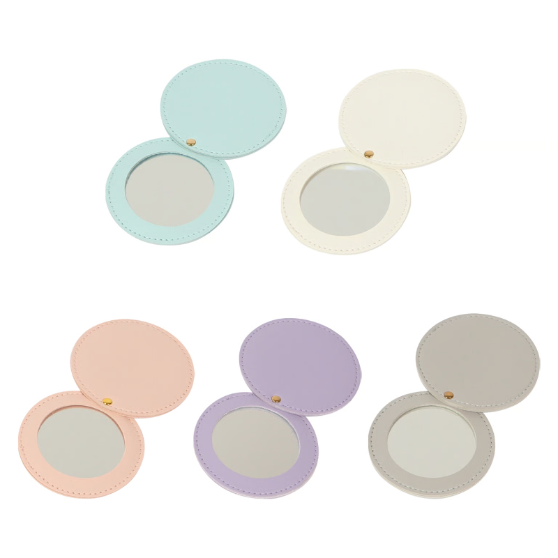 Espejo de bolsillo con cubierta fabricada en curpiel (poliuretano). Gracias a su tamaño y a que es bastante ligero, es ideal para llevarlo contigo todos los días.