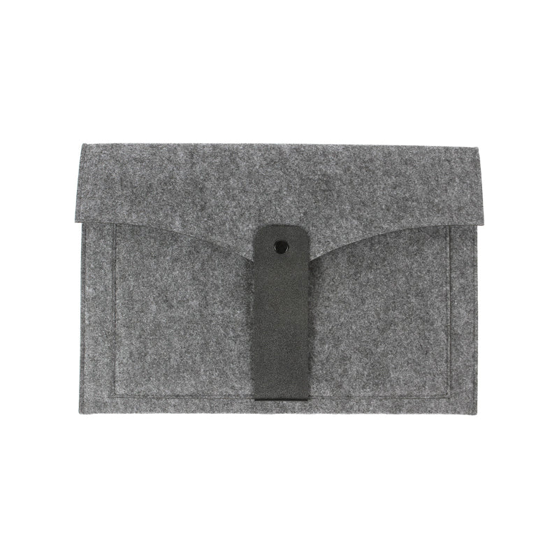 Funda para Laptop fabricada en fieltro, con cierre de broche y detalles en curpiel. Cuenta con una bolsa frontal para guardar objetos más pequeños. Funciona también como porta documentos.