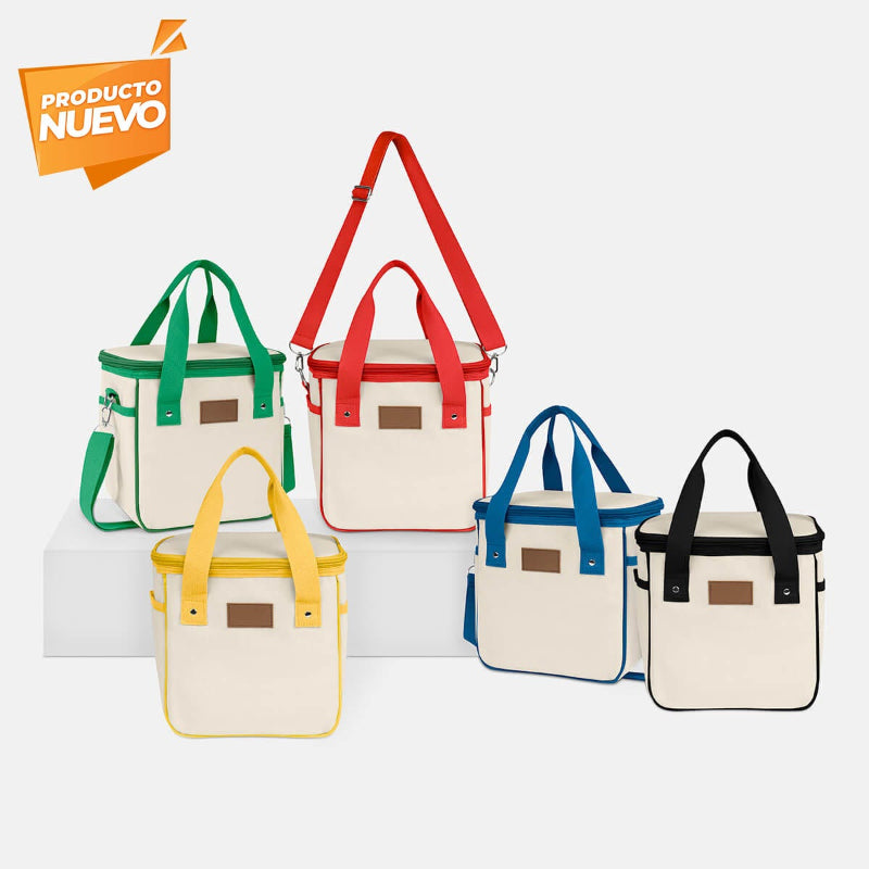 Hielera con interior sellado impermeable. Su exterior está fabricado en material algodón, un material amigable con el medio ambiente, que la hace una opción ecológica. Los detalles de color en asas y cierre le dan un toque moderno y vibrante, convirtiéndola en una opción única para llevar a picnics, la oficina o cualquier salida al aire libre. Capacidad para 9 latas.