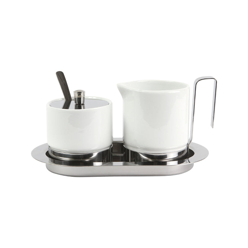 Juego de café, fabricado en cerámica y acero inoxidable. Incluye taza para crema o leche con capacidad de 300 ml, azucarera (con tapa) con capacidad de 200 ml y cuchara.