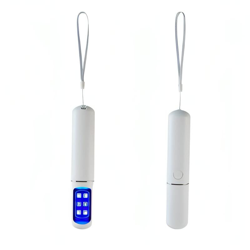 Lámpara portatil para esterilización UV, no reflejar la luz UV directo a tu cara o piel. Inlcuye cable cargador USB y sujetador.