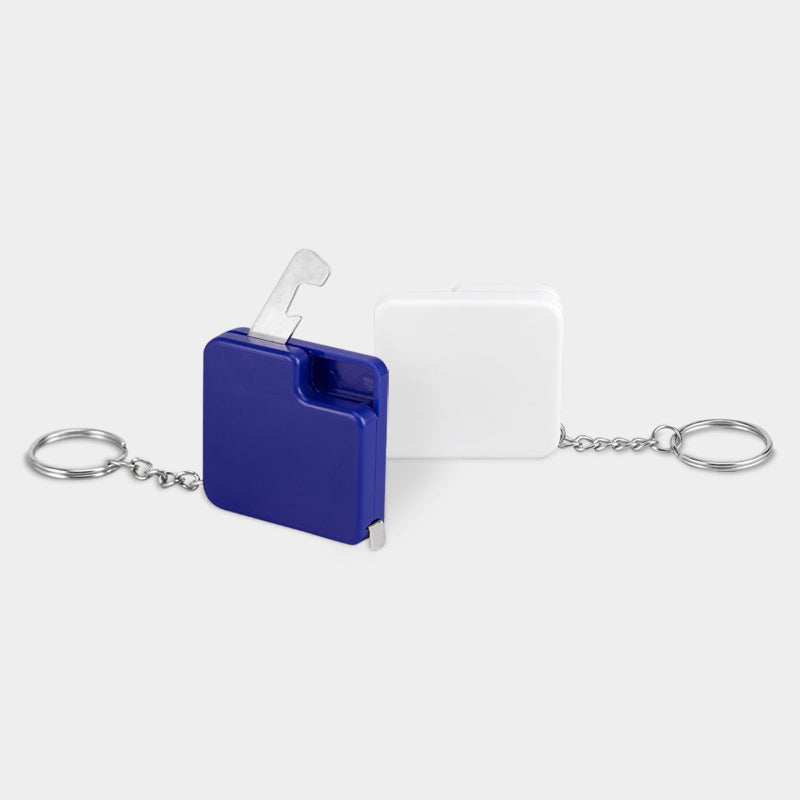 Llavero destapador con flexómetro de cinta metálica de 1 m.