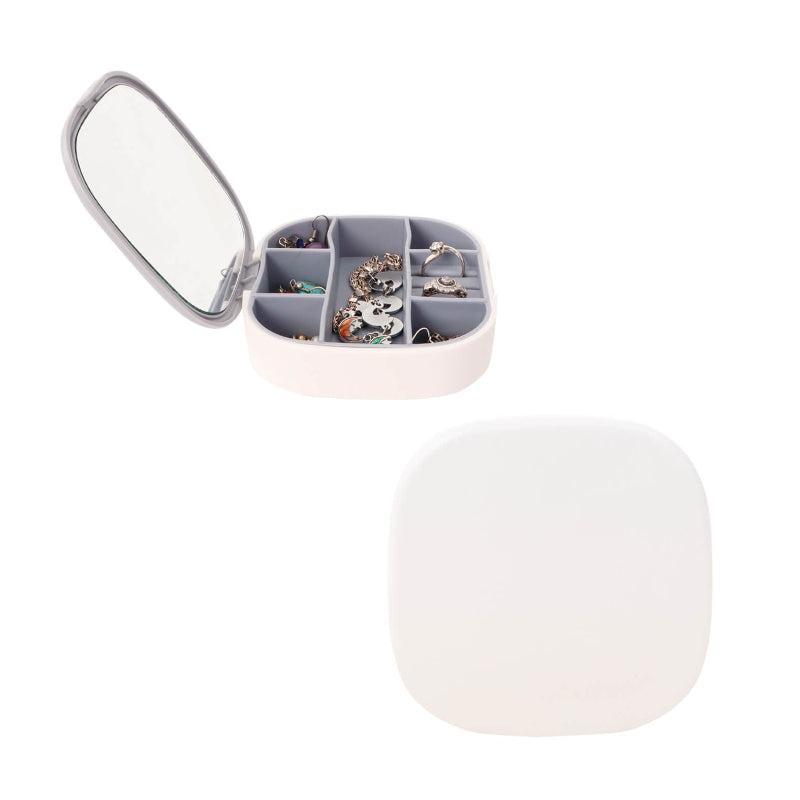 Organizador de joyas, cuenta con 6 compartimentos para accesorios, 3 ranuras para anillos y 1 espejo en la parte interior.