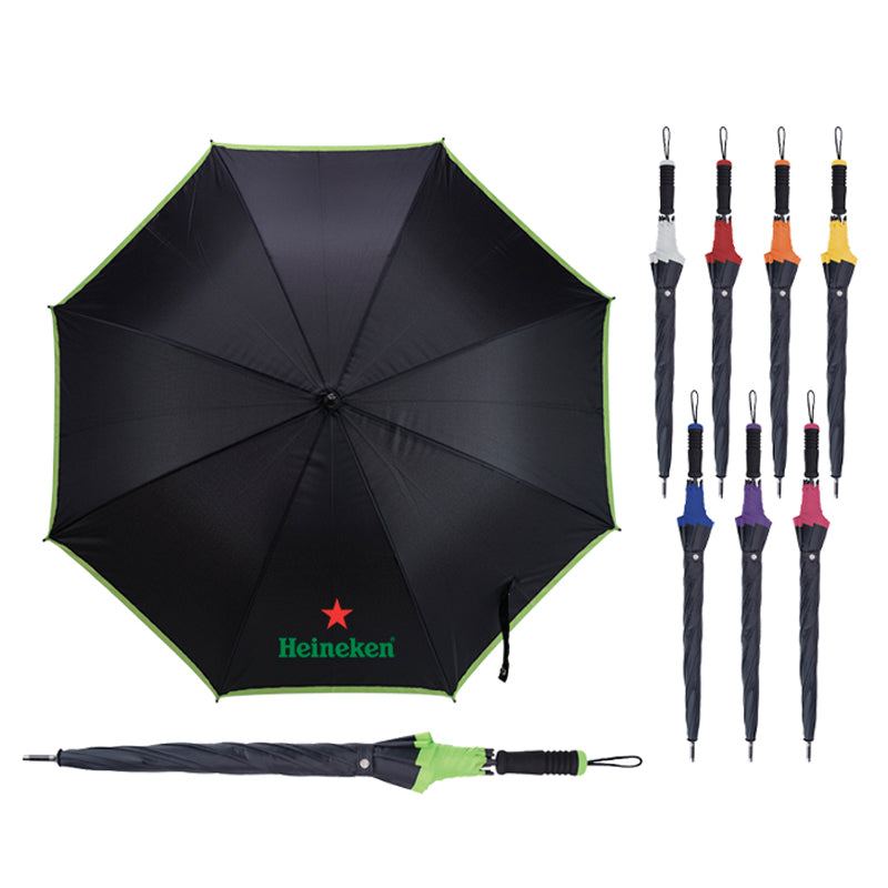 Paraguas de 8 gajos con botón de apertura automático, varillas y eje de fibra de vidrio. Cuenta con cintillo para guardar, orilla de color en los gajos, mango EVA con punta de color y cordón para transportar.