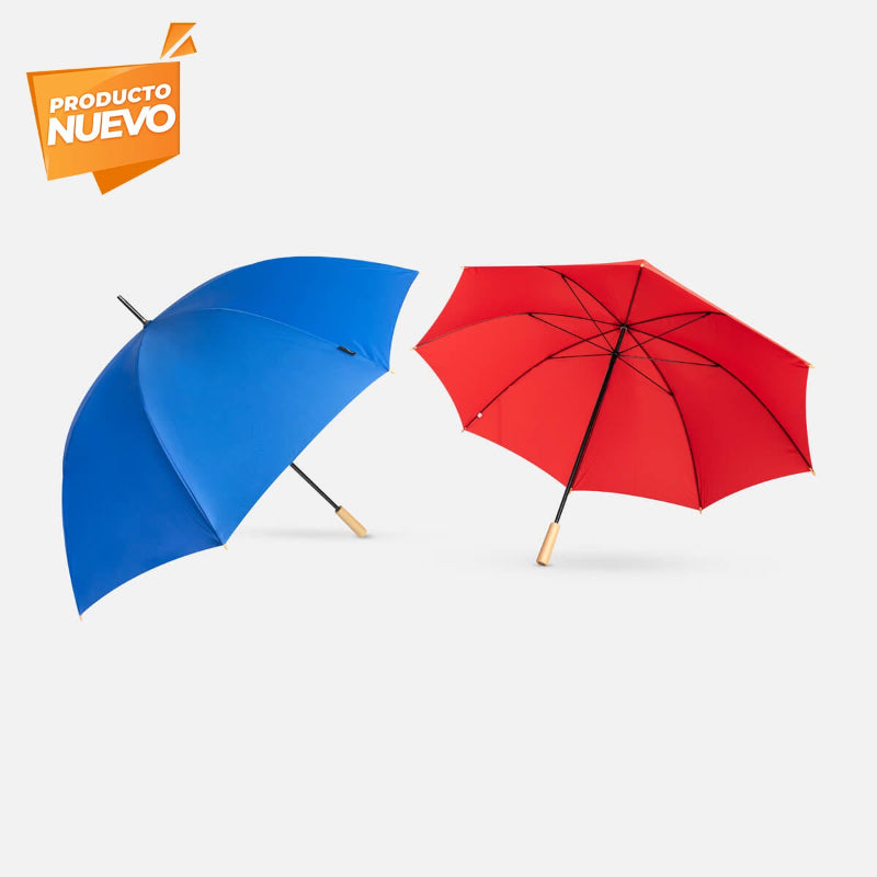 Paraguas de 8 paneles con apertura automática. fabricado en plástico reciclado (RPET). Cuenta con mango y punteras de madera. Incluye funda protectora.