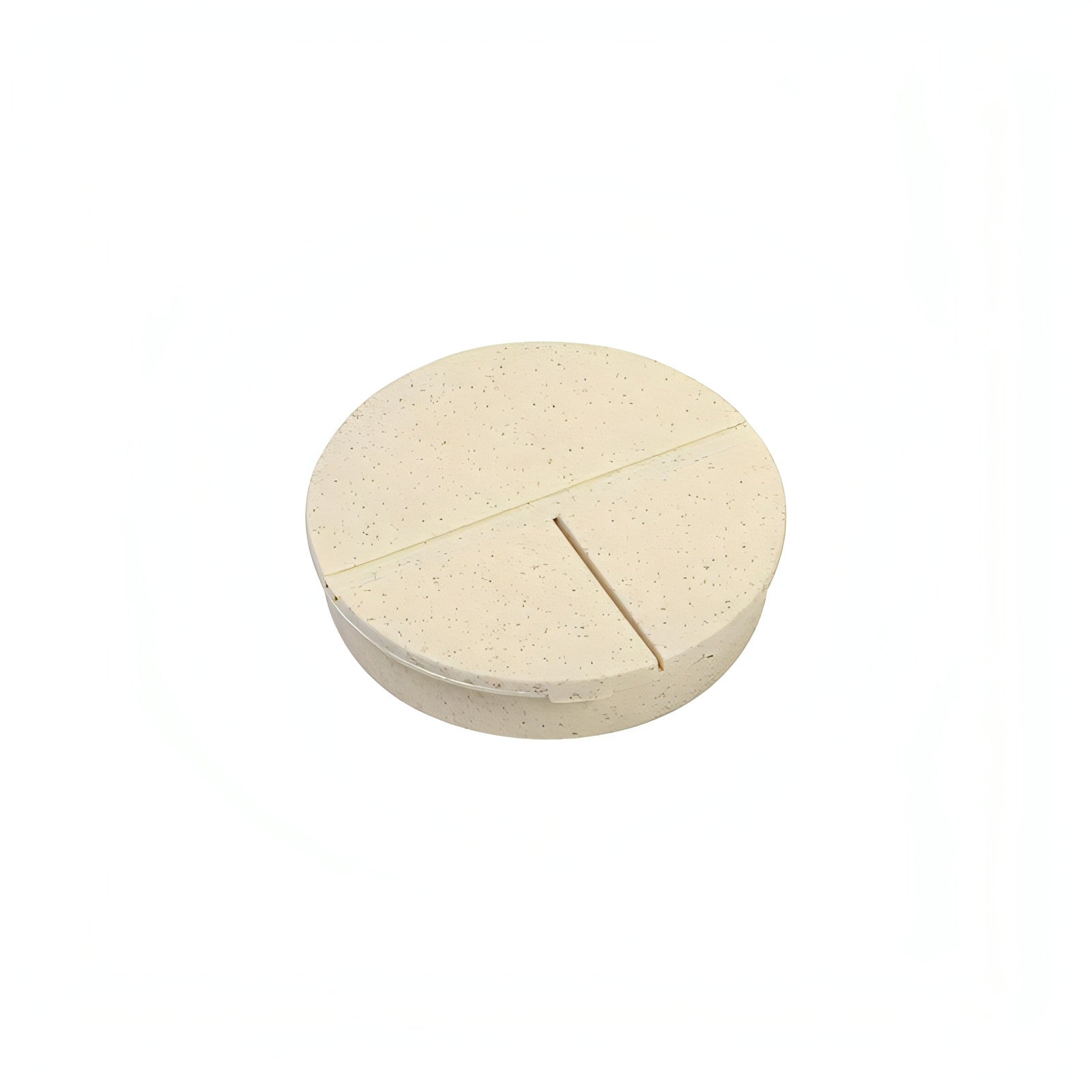 Pastillero redondo fabricado en fibra de trigo, con 2 compartimentos pequeños y uno grande. Gracias a su tamaño es ideal para llevarlo contigo todos los días.