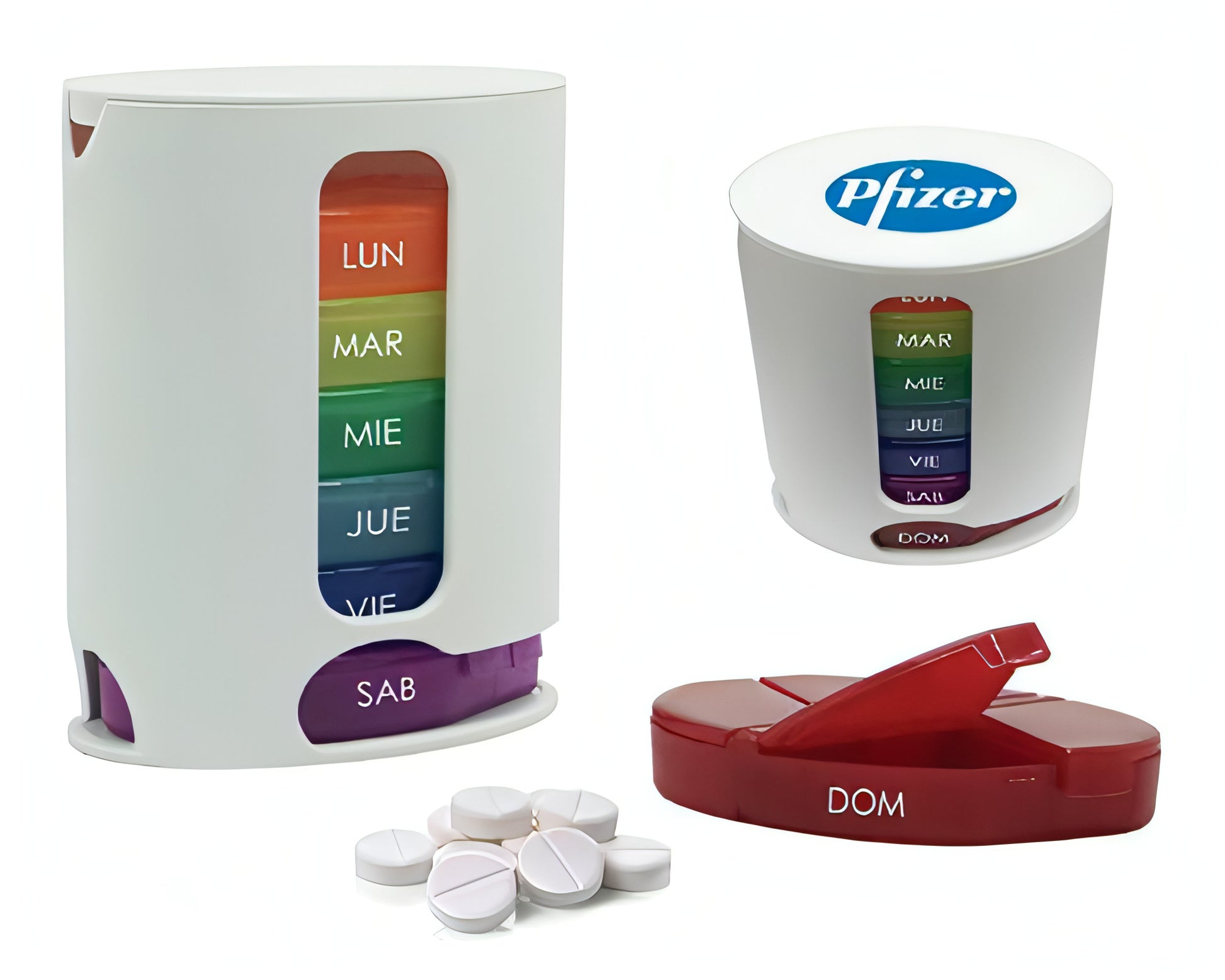 Pastillero apilable semanal, cuenta con 7 bandejas extraíbles indicando el día de la semana, cada uno tiene 4 divisiones internas para un mejor control de los horarios del día. Esta torre se carga en la parte superior y se extrae por la parte inferior.