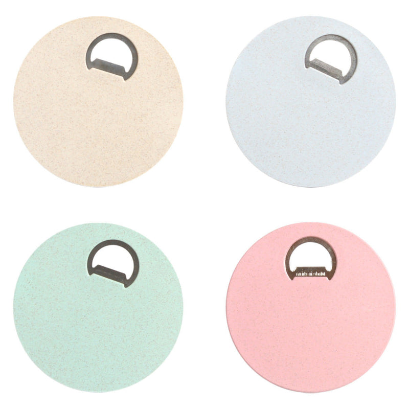 Porta vasos redondo fabricado en plástico ABS y fibra de trigo, con destapador metálico. Súper practico ya que es 2 en 1.