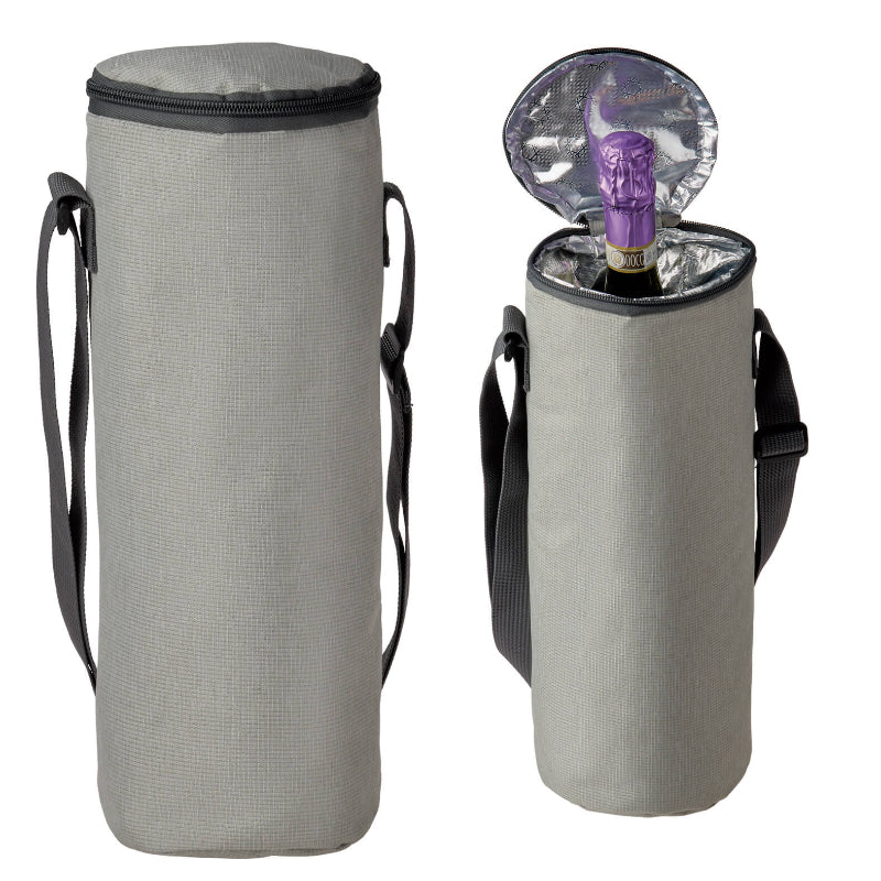 Portavino termico resistente con interior metalizado, cierre y correa ajustable.