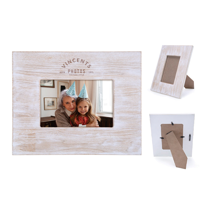 Portarretratos de madera glaseada con ventana de vidrio, ideal para fotografías de 10 x 15 cm. Cuenta con soporte de MDF, perillas de seguridad y sujetador para colgarse. Se puede acomodar de forma horizontal o vertical. Presentación: caja blanca.