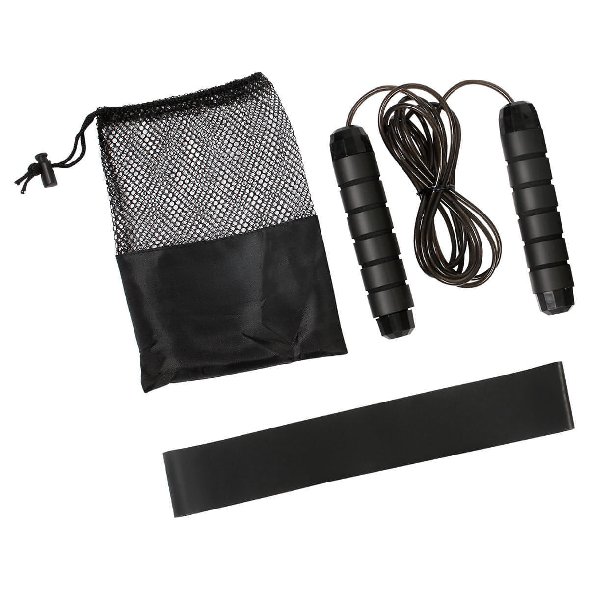 Set fitness con 1 banda elástica de 30x5 cm y 1 cuerda de 3 m; ambas fabricadas en caucho. Incluye bolso de malla con cordón y broche de seguridad. Ideal para llevarlo contigo siempre por su practico tamaño.