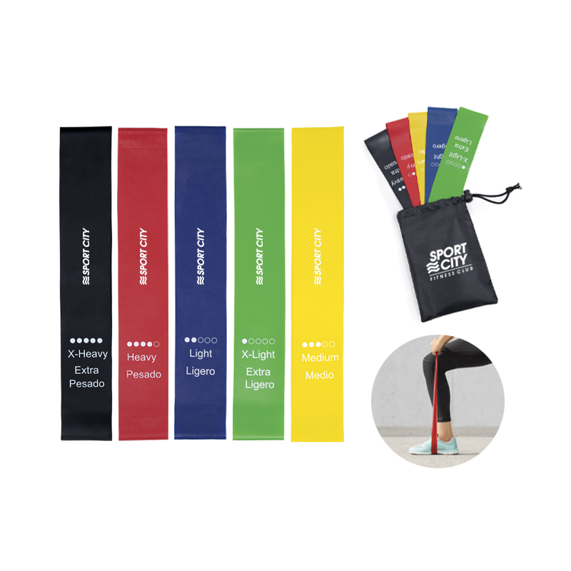 Set de ligas de resistencia de diferente tensión para ejercicio 5 en 1: cada liga cuenta con diferente tipo de dureza de acuerdo al nivel de ejercicio: color verde - extra ligero, azul - ligero, amarillo - medio, rojo - pesado y negro - extrapesado. Cuenta con funda con jareta para guardar.