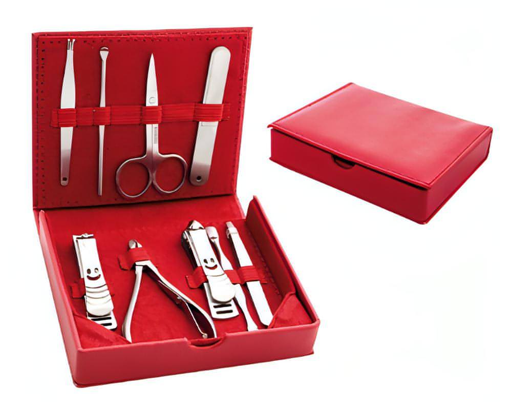 Set de manicure calidad profesional. Incluye 8 piezas: 2 cortauñas, pinzas para depilar, lima, limpiauñas, tijeras, cortacutícula, alicata y levanta-cuticula.