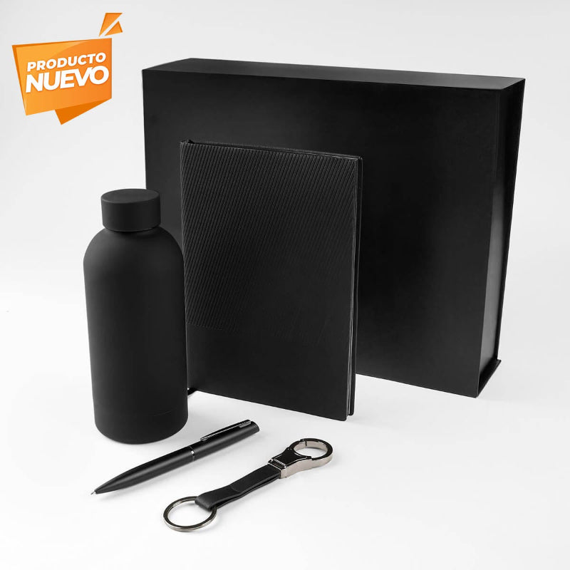 Set de regalo corporativo de 4 piezas. Incluye libreta de pasta blanda con 96 hojas a raya y listón separador, bolígrafo metálico con sistema twist, llavero de doble aro metálico con cinta de curpiel y termo de acero inoxidable de doble pared cerrado al vacío, terminado rubber que lo hace suave al tacto.
