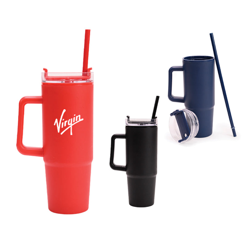 Termo de plástico de doble pared con asa. Cuenta con tapa transparente con cierre de rosca y sobre tapa giratoria en color del termo, con ranura para popote. Incluye popote de color. CAP. 770 ml.