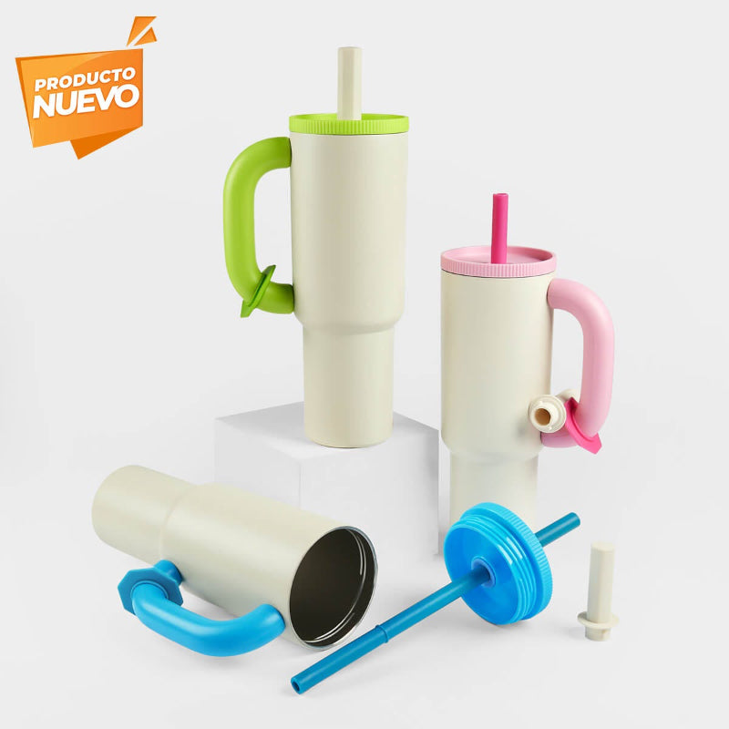 Termo doble pared . Cerrado al vacío. Pared interna y externa de acero inoxidable. Terminado en texturizado rugoso que le brinda un toque moderno y original. Incluye tapa de plástico con sistema de rosca y popote más ancho, ideal para bebidas como Frappes o licuados. Su asa extra grande le permite un agarre más cómodo y seguro. Además, cuenta con un tapón y un sistema de rosca que se integra de manera práctica al aditamento de silicón, evitando que se extravíe. Ideal para llevar a todas partes con un look moderno y diferente. Mantiene bebidas calientes por 6 hrs y frías hasta 12 hrs. Capacidad de 40 Oz. Base de 8.3 cm de diámetro.
