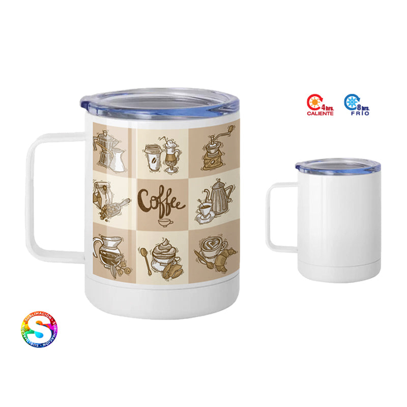 Termo de doble pared para sublimación insulado al alto vacío. Mantiene las bebidas frías por 8 hrs y calientes por 4 hrs. Tapa transparente de cierre a presión con seguro deslizable y asa. CAP. 350 ml. (12 Oz.). Presentación: Caja en color negro.