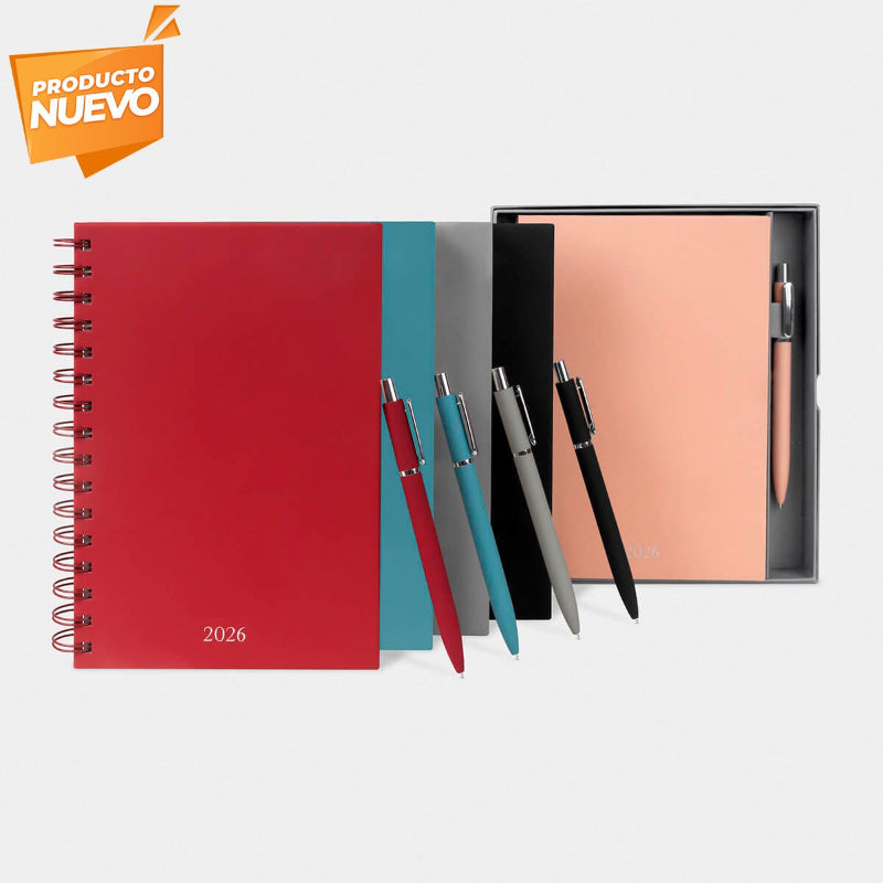Agenda diaria con 174 hojas. Contiene datos personales, calendarios 2025-2026-2027, planeador 2026, seguimiento de nuevos hábitos y días festivos. Incluye bolígrafo metálico y caja individual tipo regalo.