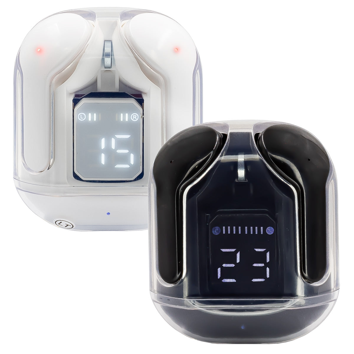 Audífonos Cristal Bluetooth 5.1 clasificación IPX4 con pantalla de energía LED. Sistema touch que permite controlar funciones como contestar llamadas, reproducir música o ajustar el volumen en los auriculares. Sonido estéreo de alta calidad. Incluye cable USB tipo C.