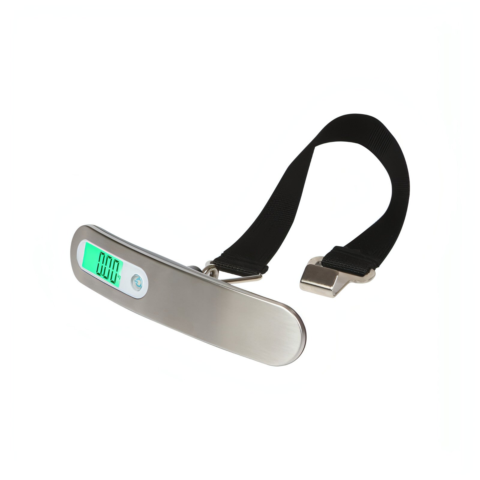 Báscula electrónica para equipaje fabricada en plástico ABS y protección de metal, con cinta de tela y gancho de metal. Sensible a un peso mínimo de 100 gr y soporta un peso máximo de 50 kg. Incluye baterías y caja de cartón.