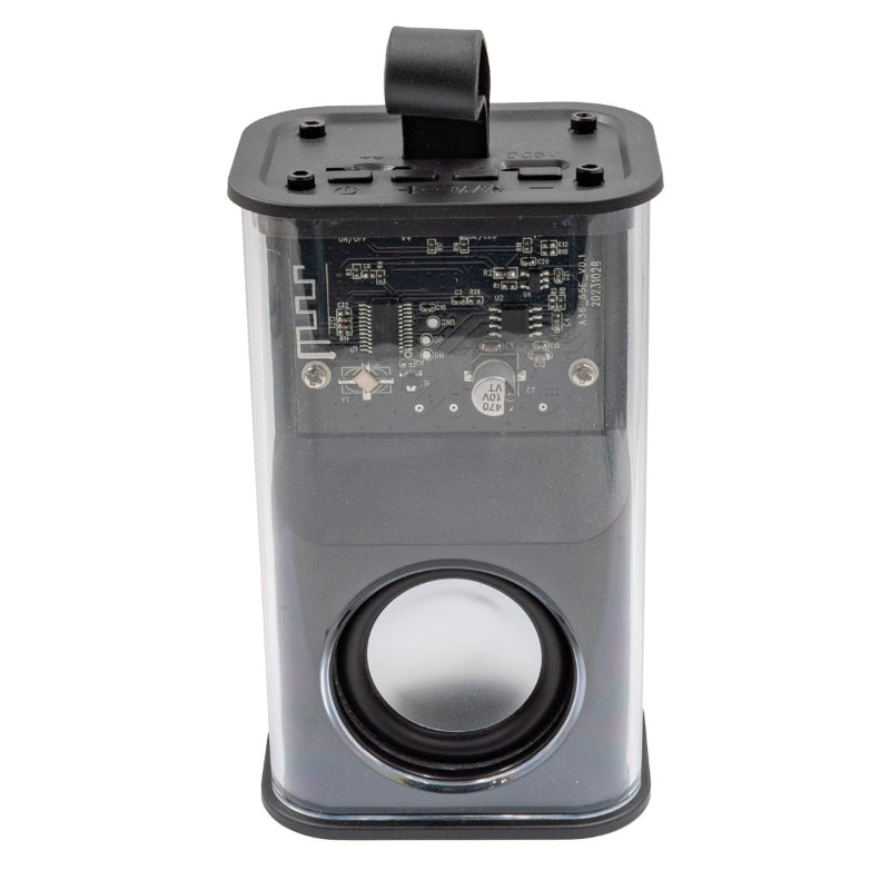 Bocina Bluetooth con batería recargable con diseño transparente, panel con iluminación LED de diversos colores y asa para colgar o transportar comodamente. Cuenta con interruptor de encendido y apagado, botón para cambiar el modo de funcionamiento y la iluminación, puerto de carga USB tipo C. Rango de conexión 10 metros. Incluye cable cargador USB tipo C.