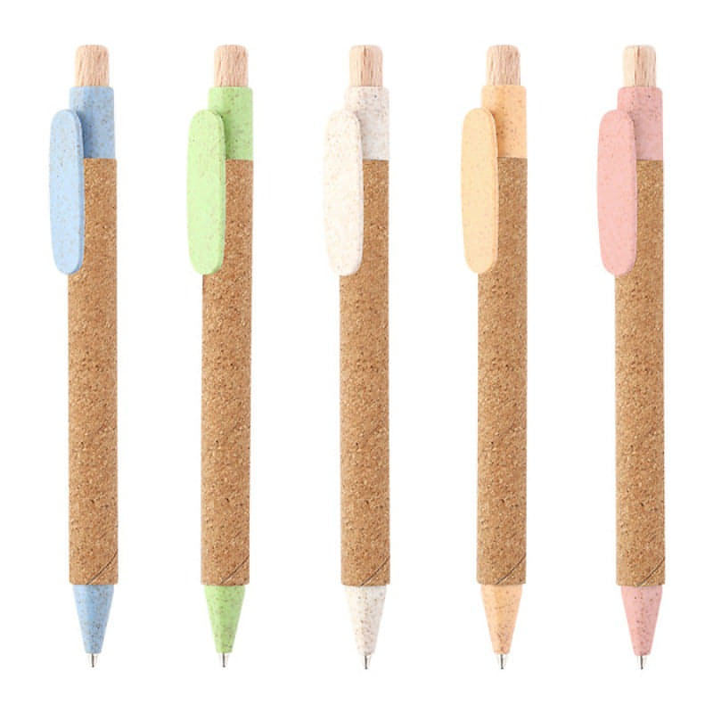Bolígrafo retráctil fabricado en corcho, clip en fibra de trigo, botón de madera y tinta de escritura negra.