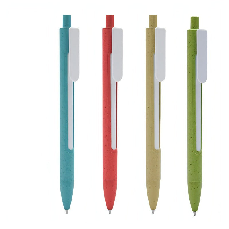 Bolígrafo con doble pared. Pared interior y clip de color blanco. Pared exterior con material de fibra de trigo. Mecanismo pulsador.