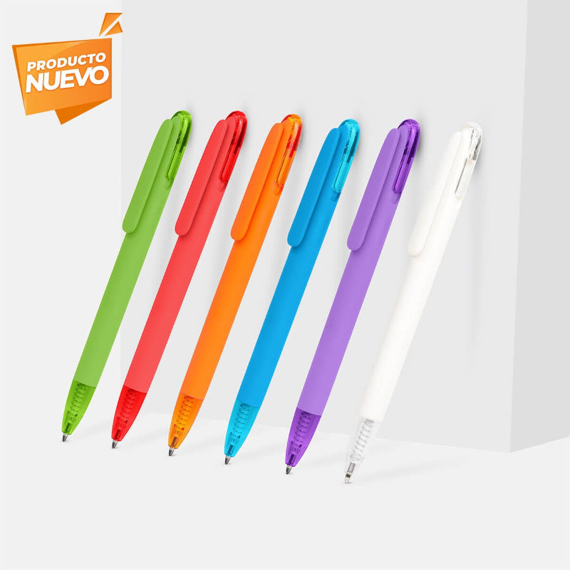 Bolígrafo de plástico con terminado rubber. Su contraste de material solido y translucido aportan un toque único a su diseño. Mecanismo pulsador.