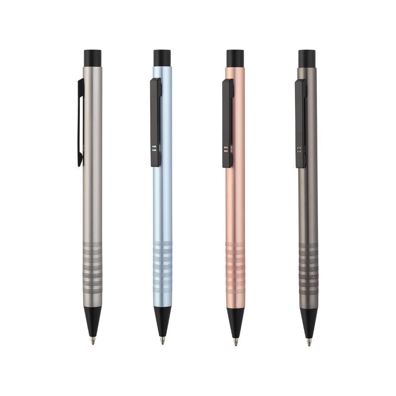 Bolígrafo con barril de aluminio acabado mate, botón de plástico y clip metálico. Tinta de escritura azul.