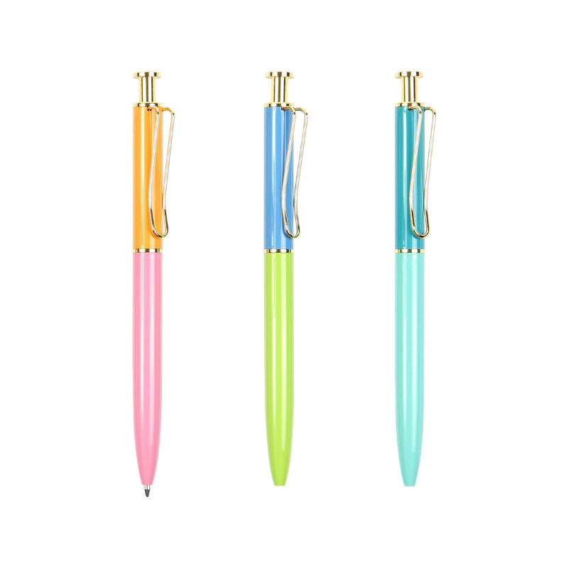 Bolígrafo con acción de empuje, barril fabricado de acero inoxidable con acabado brillante, botón de empuje y clip color dorado. Tinta de escritura negra.