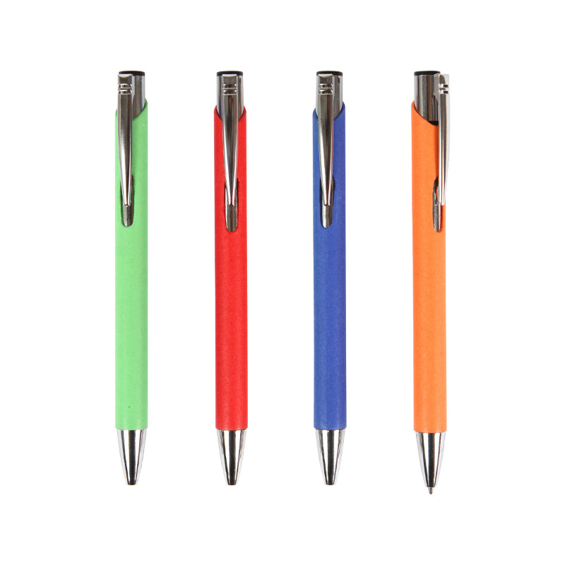 Bolígrafo con acción de empuje, cuerpo fabricado de papel en diferentes colores con adornos cromados. Tinta de escritura negra.