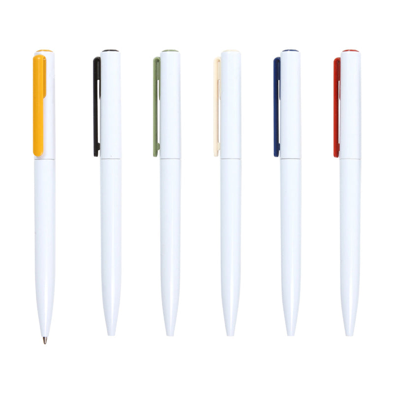 Bolígrafo de acción giratoria, cuerpo blanco sólido, clip de color sólido, recarga delgada X-20. Barril fabricado en ABS. Tinta de escritura negra.
