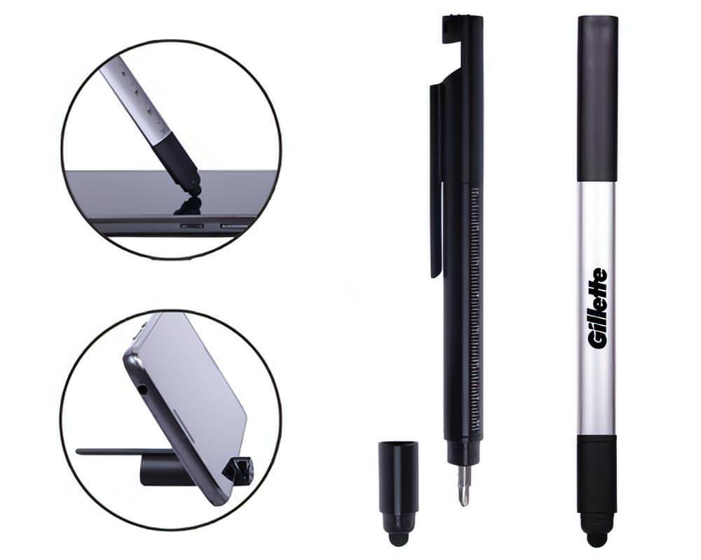 Bolígrafo de plástico 5 en 1, diseño de cuerpo triangular que cuenta con regla de 7 cm. Punta touch para pantallas táctiles. Se puede utilizar como desarmador incluye 2 puntas plano y de cruz que se fija y guarda en el cuerpo de la pluma. Tapa extraíble diseñada para usarse como base de teléfono celular.