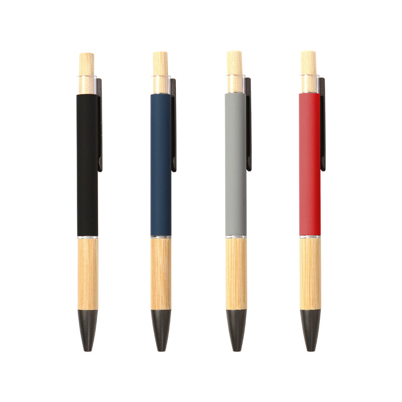 Bolígrafo de tinta azul, con mecanismo de botón, fabricado en aluminio, con clip metálico y detalles de bambú.