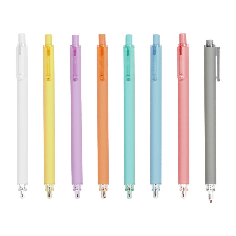 Bolígrafo con barril fabricado en plástico ABS con acabado en goma, suave al tacto. Con clip de plástico y mecanismo de botón fabricado en plástico transparente AS. Diferentes colores a elegir con tinta de escritura color azul 1.0 mm.